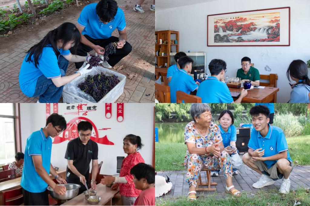 实践期间,团队成员深入生产基地与乡村一线,开展实地调研、走访、体验等活动。在农产品采摘实践环节,团队成员帮助农户采收、分拣黄瓜、葡萄并与农户交流,直观感受到了有机农业转型为农户生活带来的改变。在采访环节,实践队采访了天霞集团杨总,杨总在采访中说道:“有机蔬菜的市场需求正持续攀升,而大棚自动化设备的普及不仅提高了生产率,更让“老农民”也能享受到科技红利。”这番对话让队员们对“科技兴农”有了更具体的认知。在调研乡村民情期间,团队了解到,洼里村深入贯彻国家养老扶贫政策,为村里七十岁以上的老人开设助老食堂,彻底解决了老年人吃饭难、照料难的问题。在此期间,团队还为村内老人准备了一次午餐,并与老人共进午餐,共话家常。