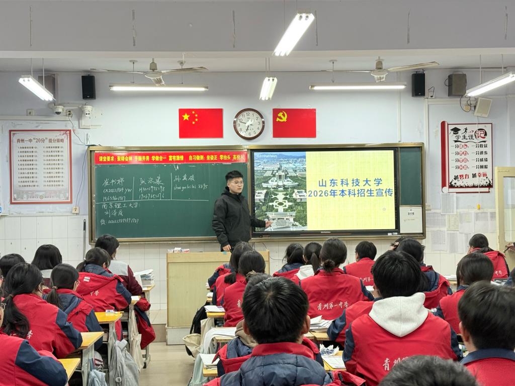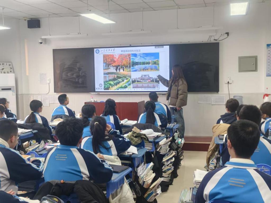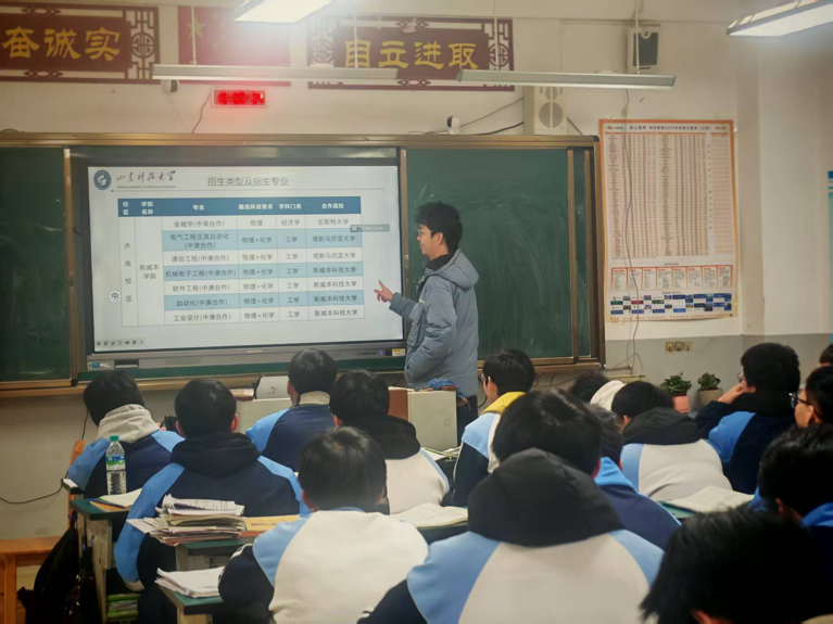 的办学历史、学科优势、特色专业,到校园环境、学习生活、社团活动,再到高考备考经验、志愿填报技巧,力求全面且实用。站在讲台上的那一刻,紧张与自豪交织,我以学长的身份,将自己在山科的所见所闻、所学所感娓娓道来,用真实的经历为他们描绘大学生活的美好蓝图。